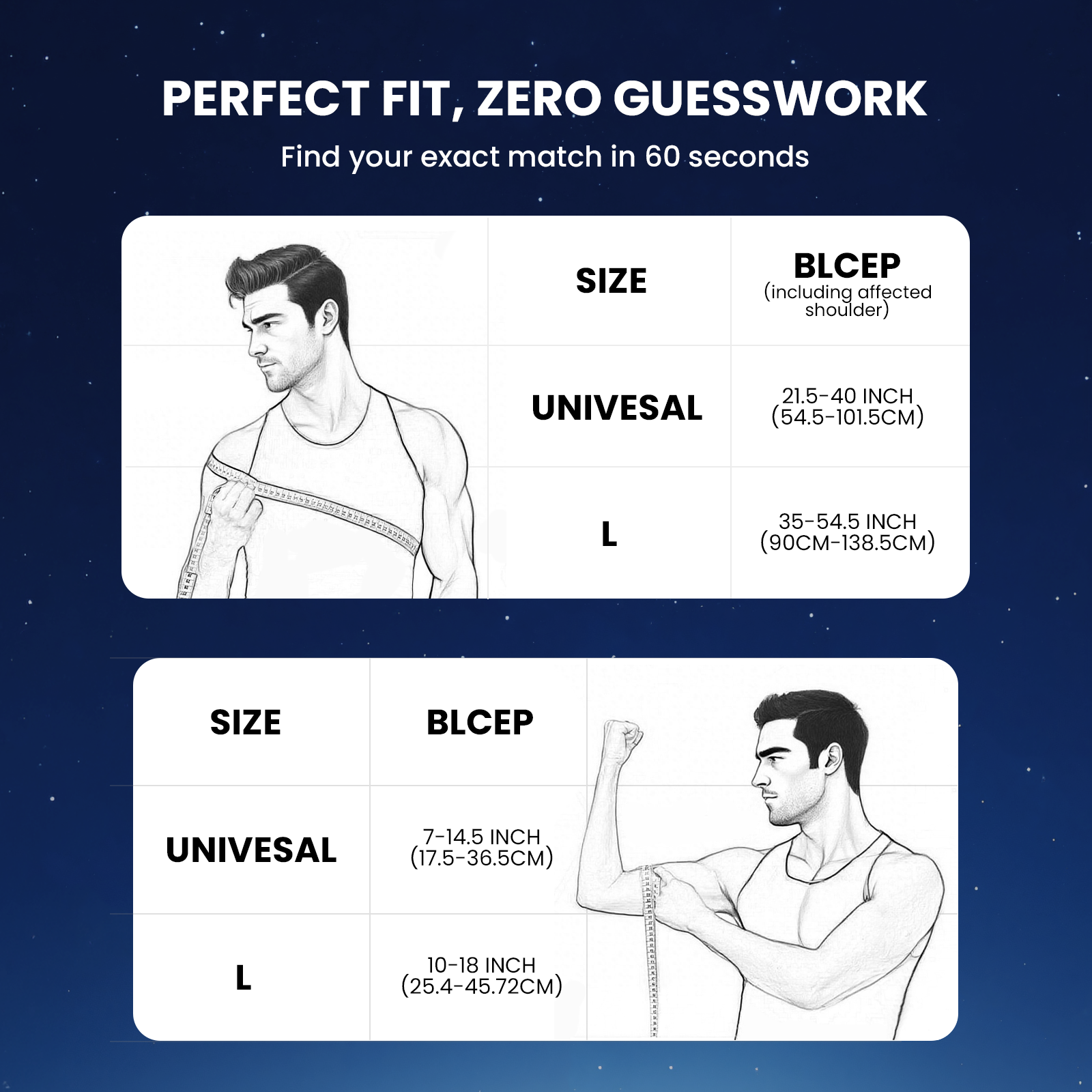 The shoulder wrap comes in Universal and Large sizes, fitting chest measurements of 21–55 inches and bicep circumferences of 7–18 inches. We recommend choosing the larger size if your measurements fall between two sizes.
