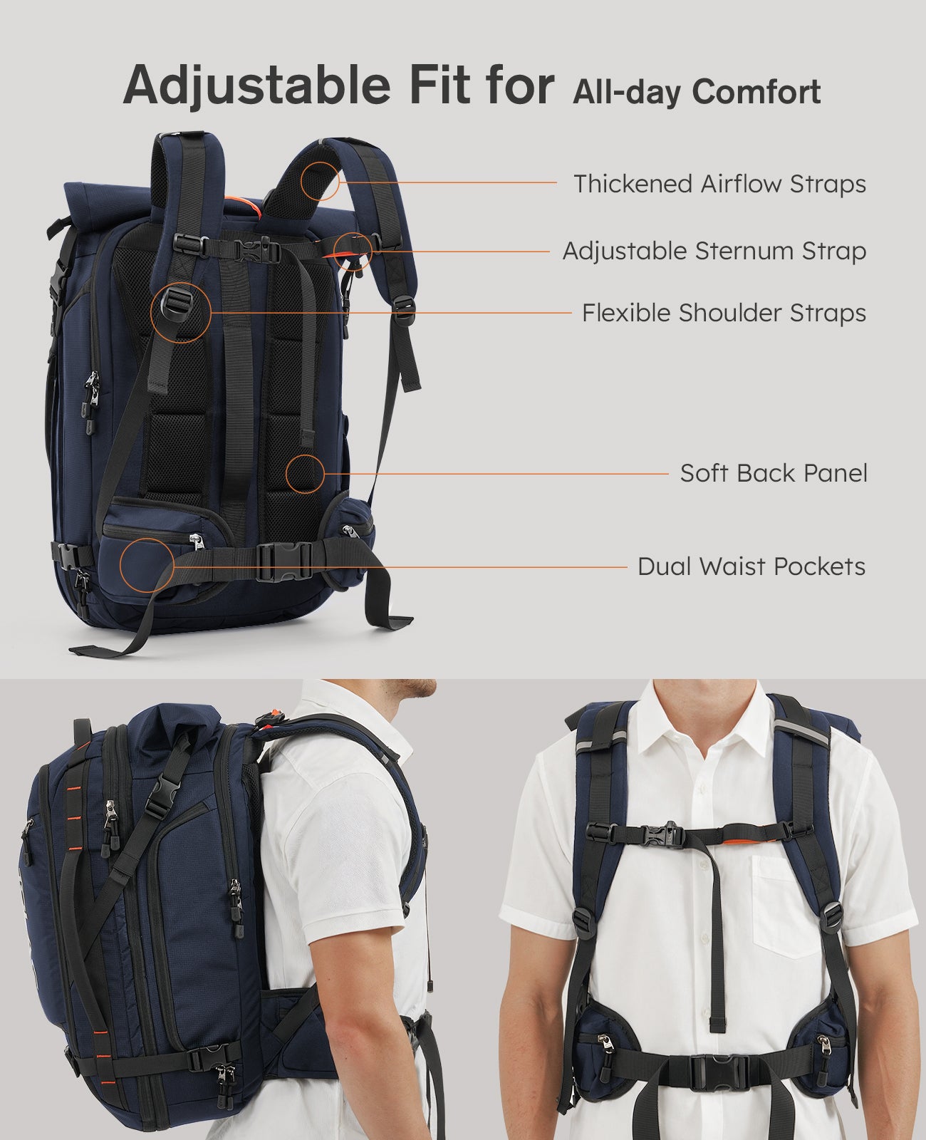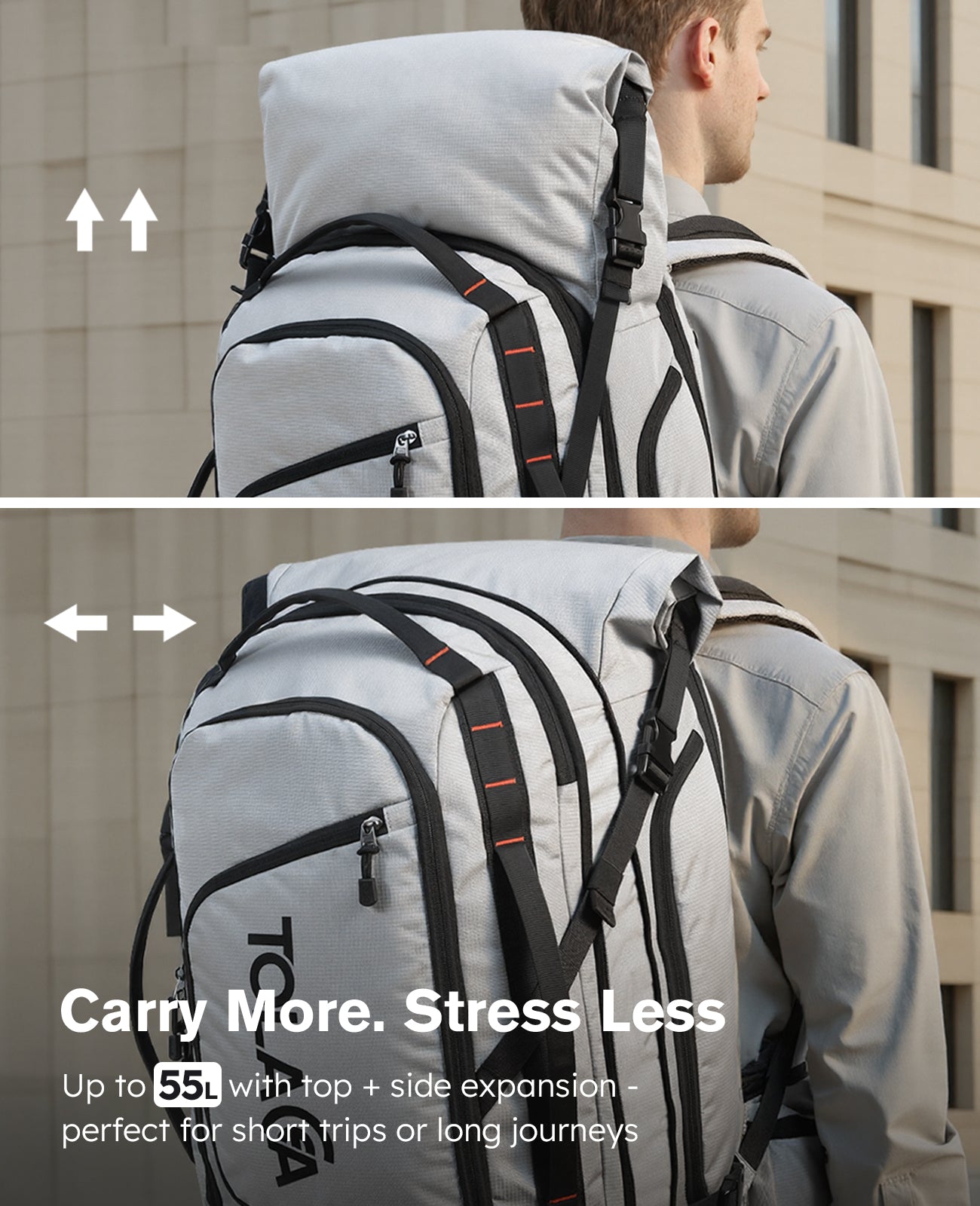 This backpack offers highly flexible capacity. Its base capacity is 40 liters, and it can be expanded (via the roll-top and likely other expansion structures) to a maximum of 55 liters. You can adjust the size according to the length of your trip and the amount of gear, making it perfectly suited for various scenarios, from daily commuting to multi-day journeys.