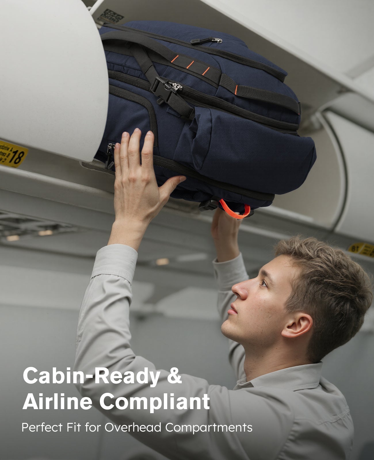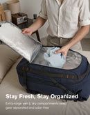 The backpack features an isolated 15L compartment at the front-top, specifically designed for storing wet or dirty items like swimwear, wet towels, or soiled clothes. The bottom of this compartment includes ventilation to promote airflow and moisture dissipation, ensuring dampness doesn't affect other clean items in the main storage area, keeping the interior organized and hygienic.