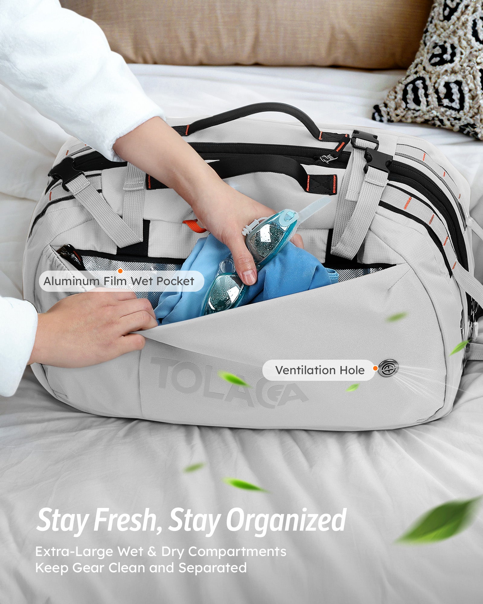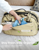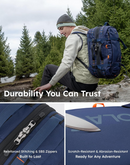 The backpack offers versatile capacity. It starts at a compact 40 liters for daily use or shorter trips and can be expanded to a spacious 50 liters, making it ideal for getaways of up to 5 days. This is achieved through a dual-compartment main storage design, which provides ample and organized space for all your gear.