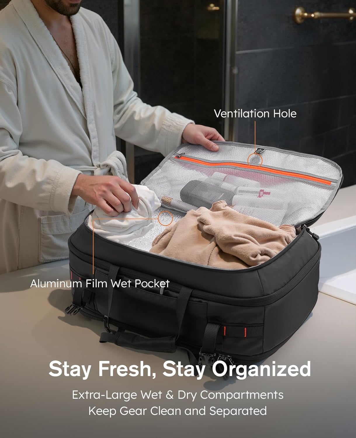 The bag is intelligently organized with multiple dedicated compartments. It features a special 10-liter wet/dry pocket lined with aluminum film to completely isolate damp clothes or swimwear. Additionally, easy-access front and side quick pockets are designed to keep frequently needed items like your passport, phone, wallet, and boarding pass secure and within immediate reach.